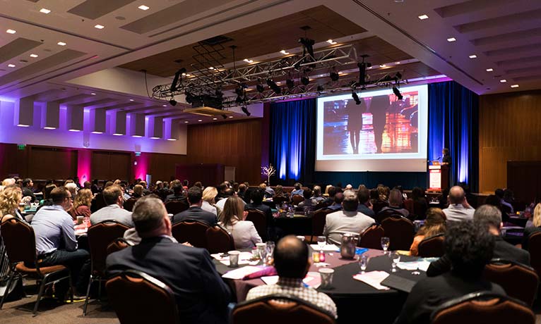 Seated conference delegates clapping.